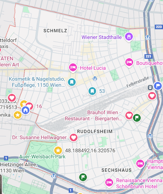 Rechts sehen Sie den Bezirk 1150 auf dem Screenshot. Die rot gepunktete Linie zeigt eindeutig, wo dieser Bezirk liegt.