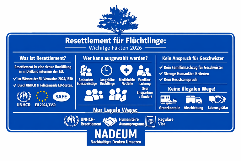 Diese Informationen stammen aus offiziellen EU‑Rechtsquellen (EUR‑LEX) und UNHCR‑Dokumenten. Sie dienen dazu, falsche Versprechen und gefährliche Fehlinformationen zu verhindern. Die Entscheidung über Resettlement trifft ausschließlich UNHCR oder eine gleichwertige Organisation.