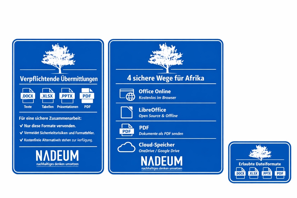 Um unsere gemeinsame Arbeit sicher, kompatibel und für alle verständlich zu gestalten, gelten für die Übermittlung von Dokumenten folgende verbindliche Standards. Sie dienen dem Schutz unserer Systeme und der Vereinheitlichung der Kommunikation zwischen europäischen und afrikanischen Mitgliedern.